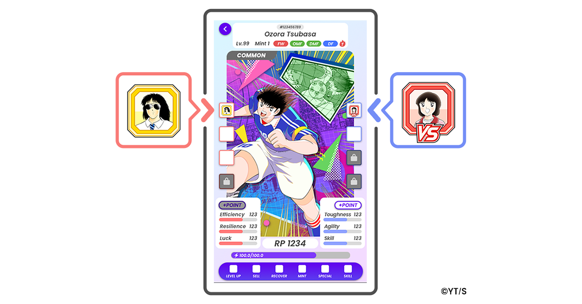 辅助人物可通过合成3个同种类／同等级者来升级。所需$TSUBASAUT数量及成功率等条件因等级而异。