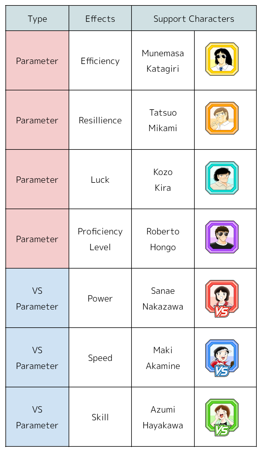 参数插槽分为Efficiency／Resilience／Luck／熟练程度4种，VS参数分为力量／速度／ 技能3种，均可分别配置与插槽相同类型的辅助人物。&#x20;
