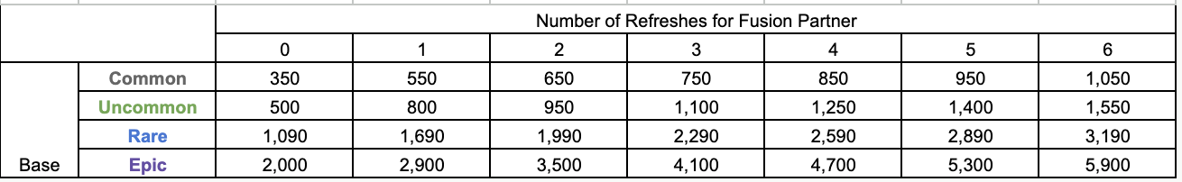 Even if the fusion partner is dropped to a lower rarity by using items, etc., the cost depends on the original rarity of the partner and the number of times the partner refreshes.